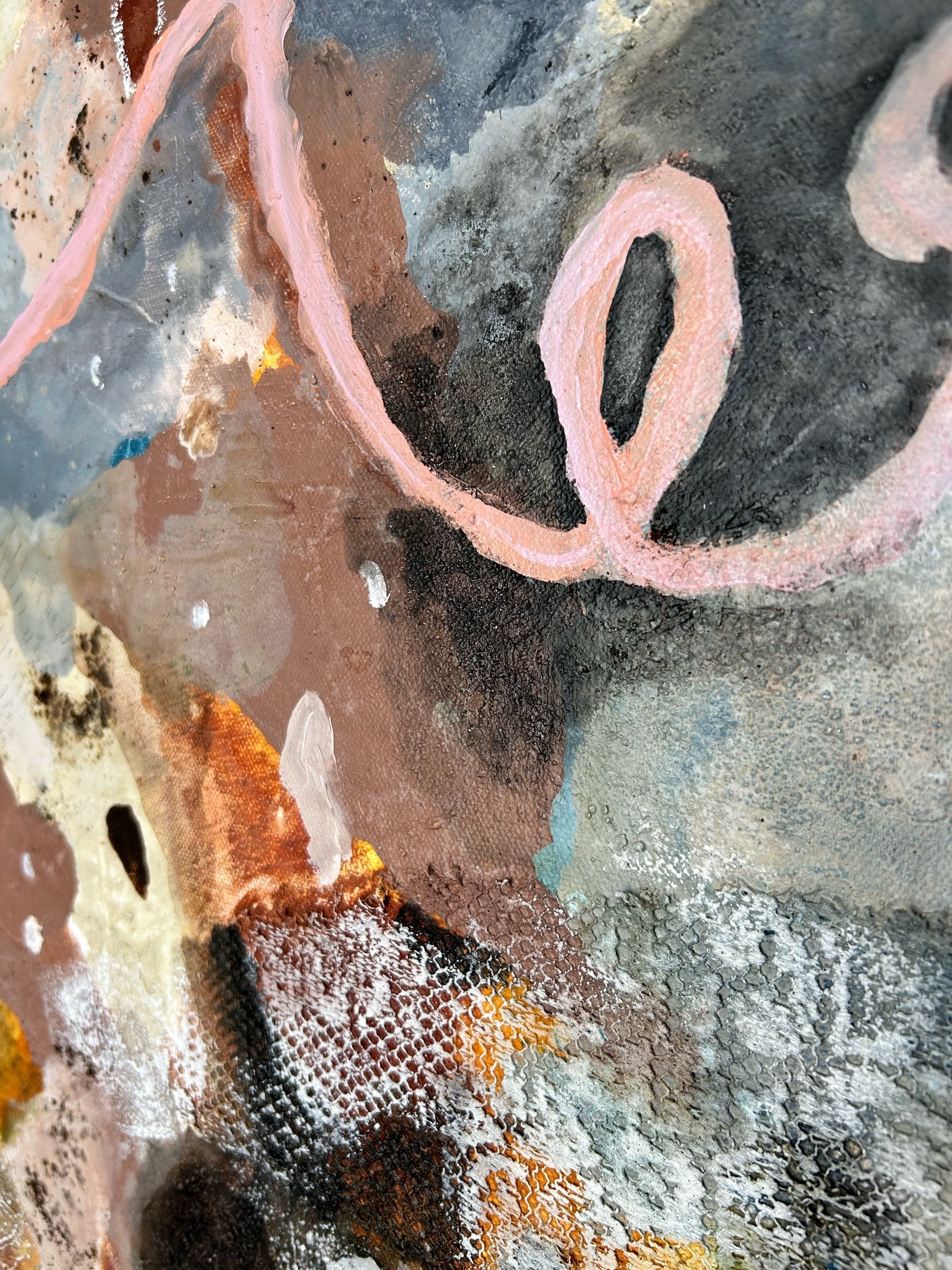 Mixed Media on Canvas. Acrylic Ink, oil pastel, pencil, coffee, collaged vintage lace.